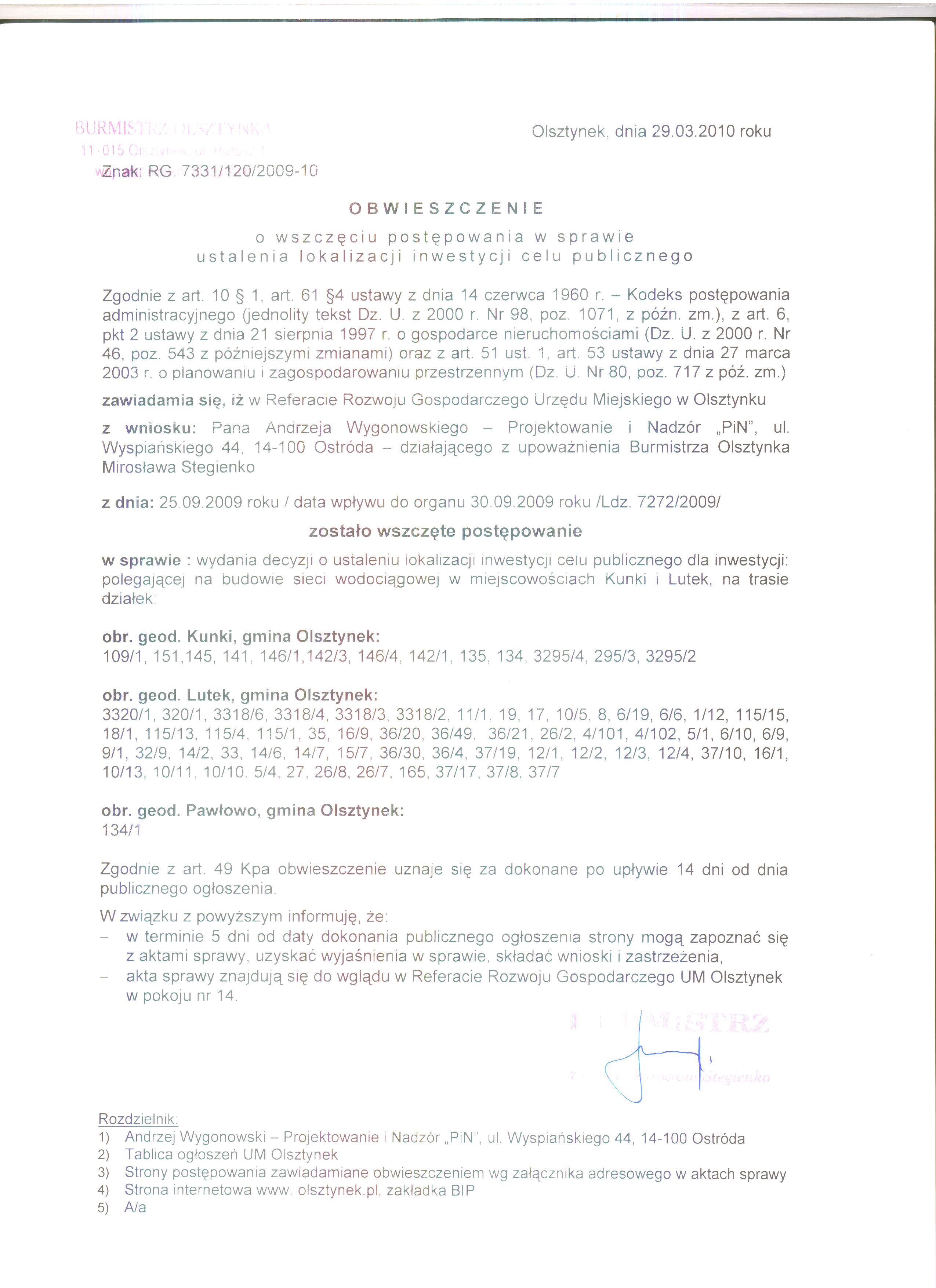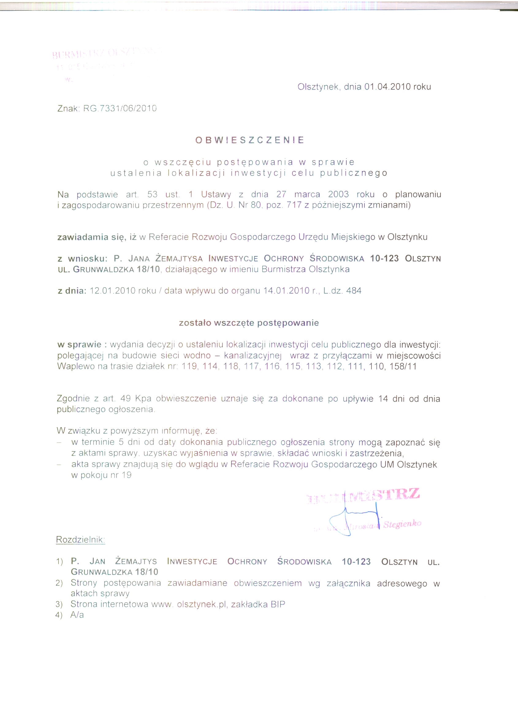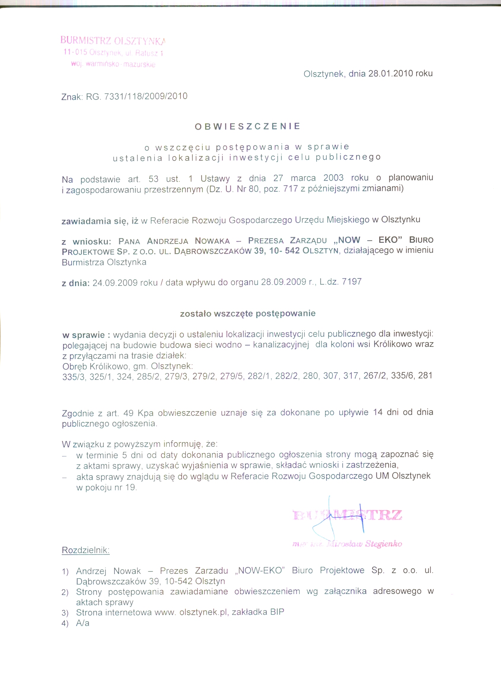 Obwieszczenie o wszczeciu postepowania - Budowa sieci wodno-kanalizacyjnej Olsztynek.doc