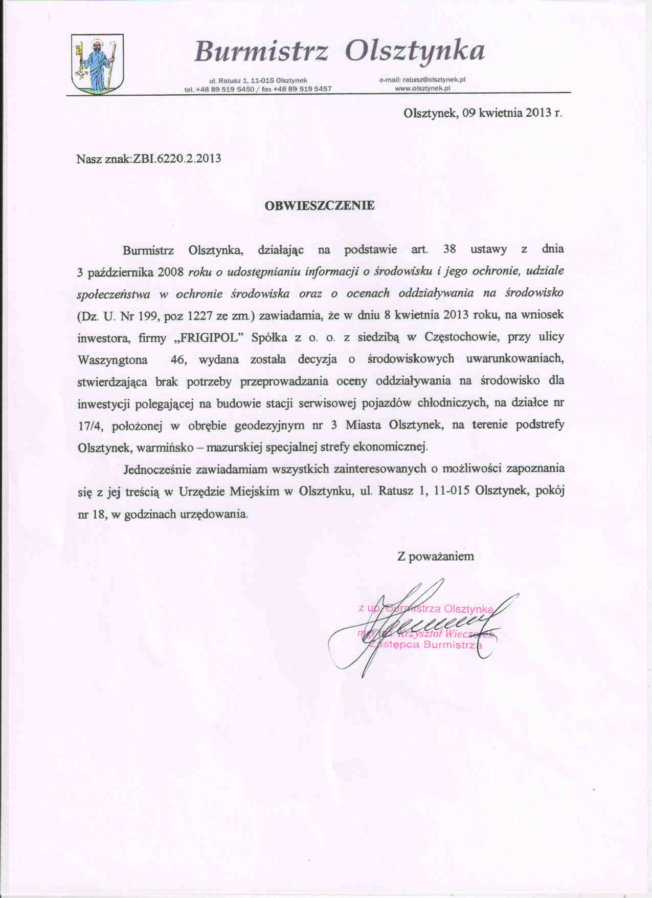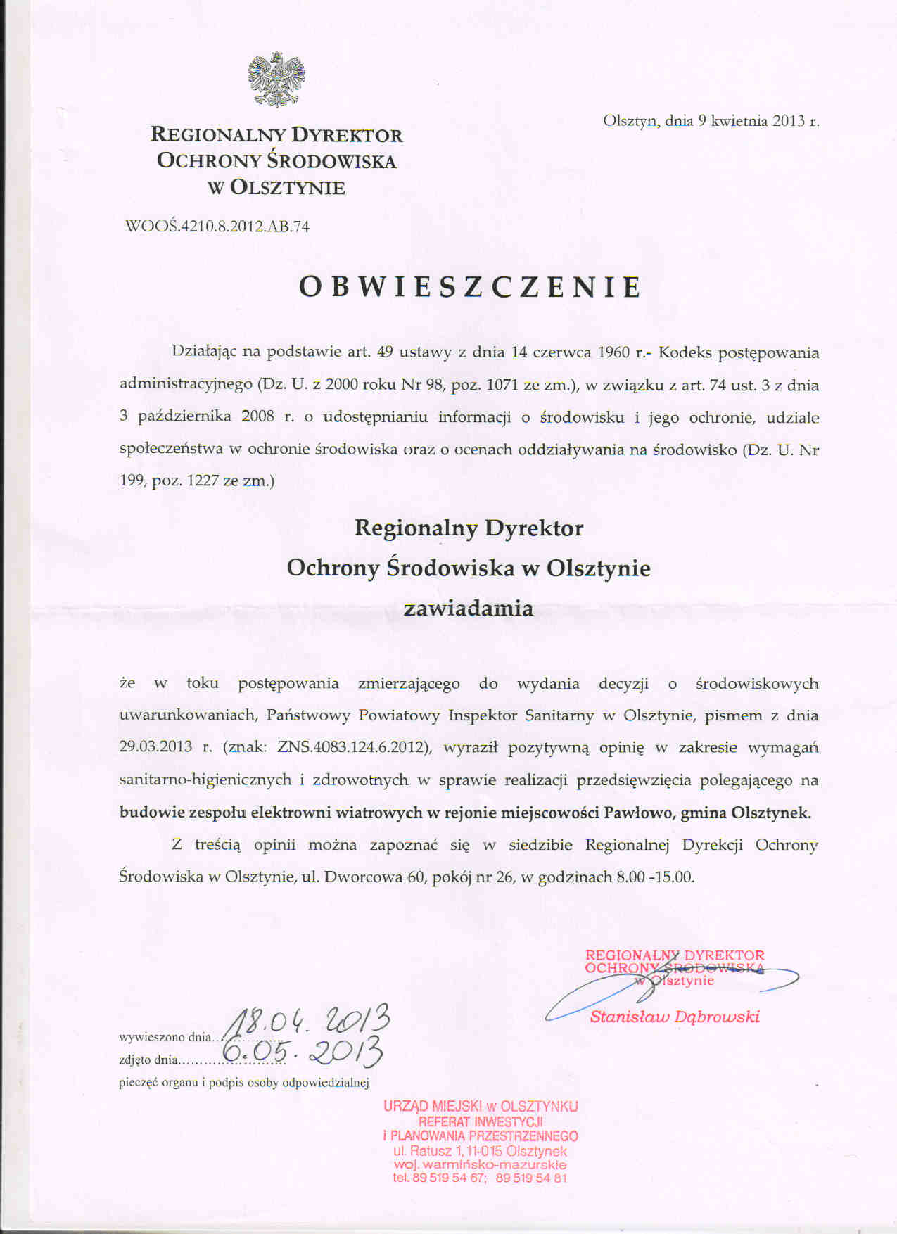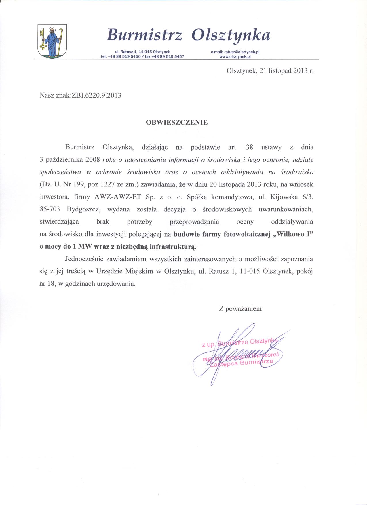Powiadomienie RDOŚ Olsztyn WOOŚ.420.16.2024.MK.22